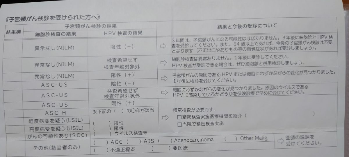 子宮頸がん検診を受けられた方には、このような用紙が送られてくると思います。結果欄にチェックが入って送られてくる、もしくは、検査をした病院にて確認をしましょう。