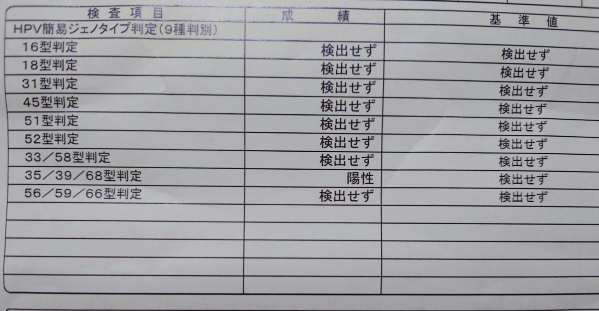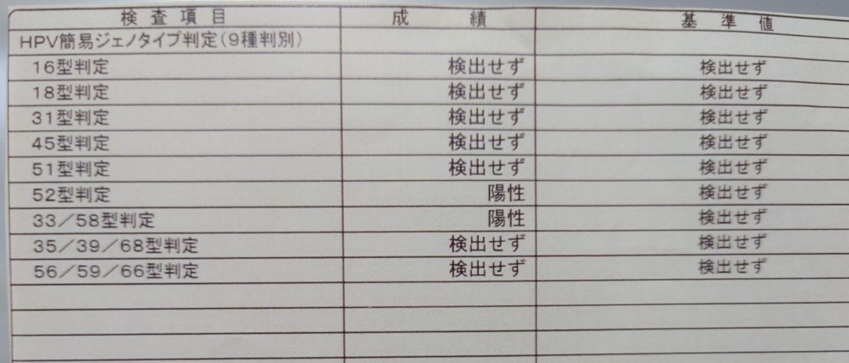 この検査結果は高齢浸潤癌になりやすいタイプ(31・33・35・45・52・58)のHPV型の2項目が陽性です。この場合も、さらに「子宮頸部組織診」を行います。その後は、医師からの3~6ヶ月ごとの細胞診検査を受けるように指示されることとなりますので、しっかり検査をしていきましょう。
