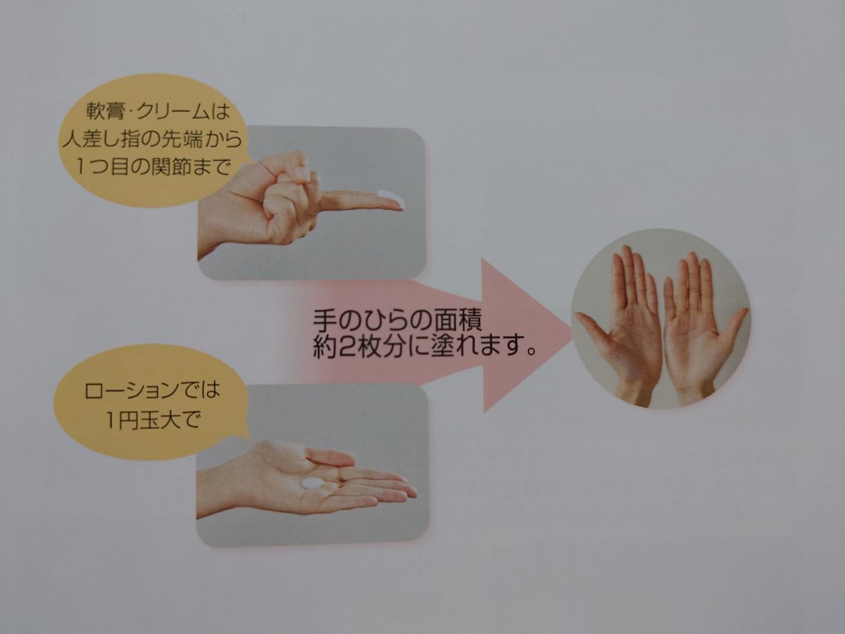 軟膏やクリームは、人差し指の先端から1つ目の関節まで伸ばした量で、ローションの場合は、1円玉大の量で両手分になります。また、塗ったあとにティッシュが皮膚に付く、テカる程度もしっかりつけているという量になります。