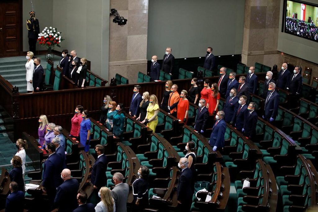 LGBTの人たちの支えになろうと、国内外ではさまざまな連帯の動きがあるのです。ドゥダ大統領の就任式で、複数の下院議員たちがそれぞれの衣服でレインボーを表現し、就任式の出席者席をレインボーカラーに染めました。