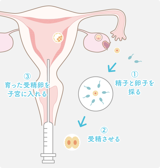 体外受精とは、排卵直前の状態まで育った卵子を卵巣から採取し、培養液の中で受精させ、ある程度、発育したものを子宮にいれるという方法です。体外での受精・培養に高度な技術を要するのはもちろんですが、決して特殊な方法ではなく、最近では一般的な治療法の一つとなっています。妊娠が成立するまでの複雑な過程のごく一部を少し手助けする治療になります。